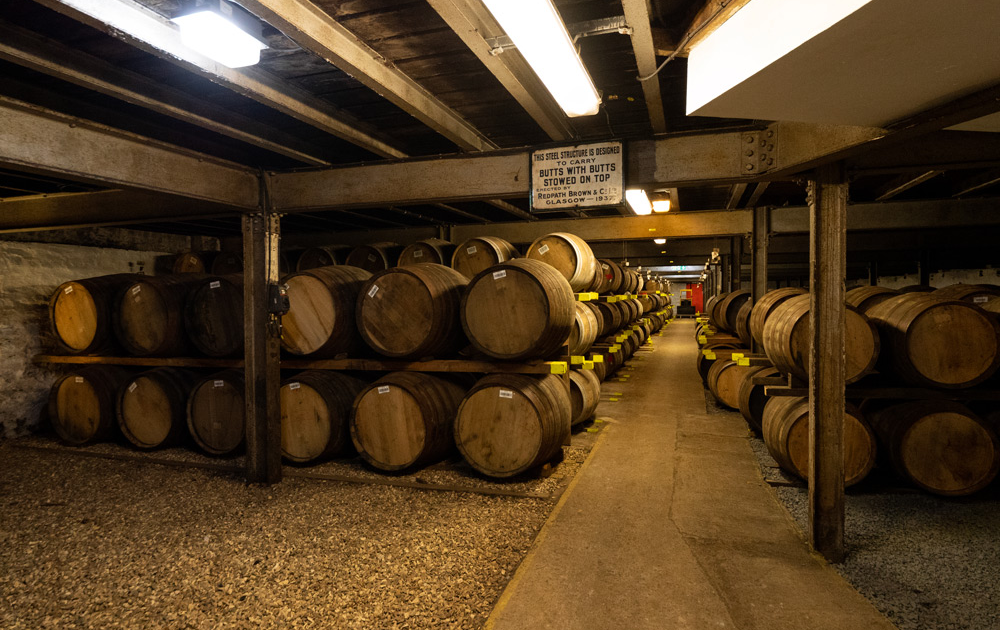 熟成庫は海岸線に面して建っており、約2万樽以上のウイスキーが静かに眠っています。大西洋からの湿った潮風が常に吹き付ける環境で、樽は呼吸をし、長い年月の間に潮の香り(ヨード、塩気)を微量に取り込んでいきます。